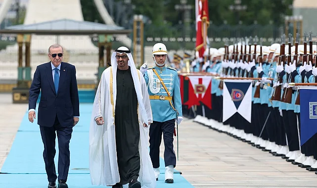 Cumhurbaşkanı Recep Tayyip Erdoğan, Türkiye'yi ziyaret eden Birleşik Arap Emirlikleri (BAE) Devlet Başkanı Şeyh Muhammed bin Zayed Al Nahyan'ı resmî törenle karşıladı.ANKARA (İGFA) - BAE Devlet Başkanı Al Nahyan'ın makam aracını, Cumhurbaşkanlığı Külliyesi önündeki caddede karşılayan süvariler, araca protokol kapısına kadar eşlik etti.Cumhurbaşkanı Erdoğan, Al Nahyan'ı külliyenin ana giriş kapısında karşıladı. Cumhurbaşkanı Erdoğan ve BAE Devlet Başkanı Al Nahyan'ın tören alanındaki yerlerini almasının ardından bando iki ülkenin millî marşlarını çaldı. Törende, tarihte kurulan 16 Türk devletini temsil eden bayraklar ve askerlere de yer verildi, 21 pare top atışı yapıldı.BAE Devlet Başkanı Al Nahyan, Muhafız Alayı Tören Kıtası'nı "Merhaba asker" diyerek selamladı. Cumhurbaşkanı Erdoğan ve Al Nahyan birbirlerine heyetlerini takdim etti.Cumhurbaşkanı Erdoğan ve Al Nahyan, merdivenlerde Türkiye ve BAE bayrakları önünde tokalaşarak basın mensuplarına poz verdi.İkili görüşmeye geçen Cumhurbaşkanı Erdoğan ve BAE Devlet Başkanı Al Nahyan, görüşmelerin ardından Türkiye ile Birleşik Arap Emirlikleri arasında 2023'te tesis edilen Yüksek Düzeyli Stratejik Konsey'in ilk toplantısına başkanlık edecek.Cumhurbaşkanı Erdoğan, Al Nahyan onuruna resmî akşam yemeği verecek.İletişim Başkanlığı'ndan aktarılan habere göre törende, Enerji ve Tabii Kaynaklar Bakanı Alparslan Bayraktar, Hazine ve Maliye Bakanı Mehmet Şimşek, İçişleri Bakanı Ali Yerlikaya, Millî Savunma Bakanı Yaşar Güler, Sanayi ve Teknoloji Bakanı Mehmet Fatih Kacır, Ulaştırma ve Altyapı Bakanı Abdulkadir Uraloğlu, MİT Başkanı İbrahim Kalın, Cumhurbaşkanlığı İletişim Başkanı Burhanettin Duran, Cumhurbaşkanlığı Savunma Sanayii Başkanı Haluk Görgün, Cumhurbaşkanlığı Genel Sekreteri Hakkı Susmaz, Cumhurbaşkanı Dış Politika ve Güvenlik Başdanışmanı Akif Çağatay Kılıç, Cumhurbaşkanlığı Yatırım Ofisi Başkanı Ahmet Burak Dağlıoğlu, Dışişleri Bakan Yardımcısı Nuh Yılmaz, Ticaret Bakan Yardımcısı Mahmut Gürcan, Türkiye'nin BAE Büyükelçisi Lütfullah Göktaş ile Ankara Valisi Vasip Şahin de yer aldı.