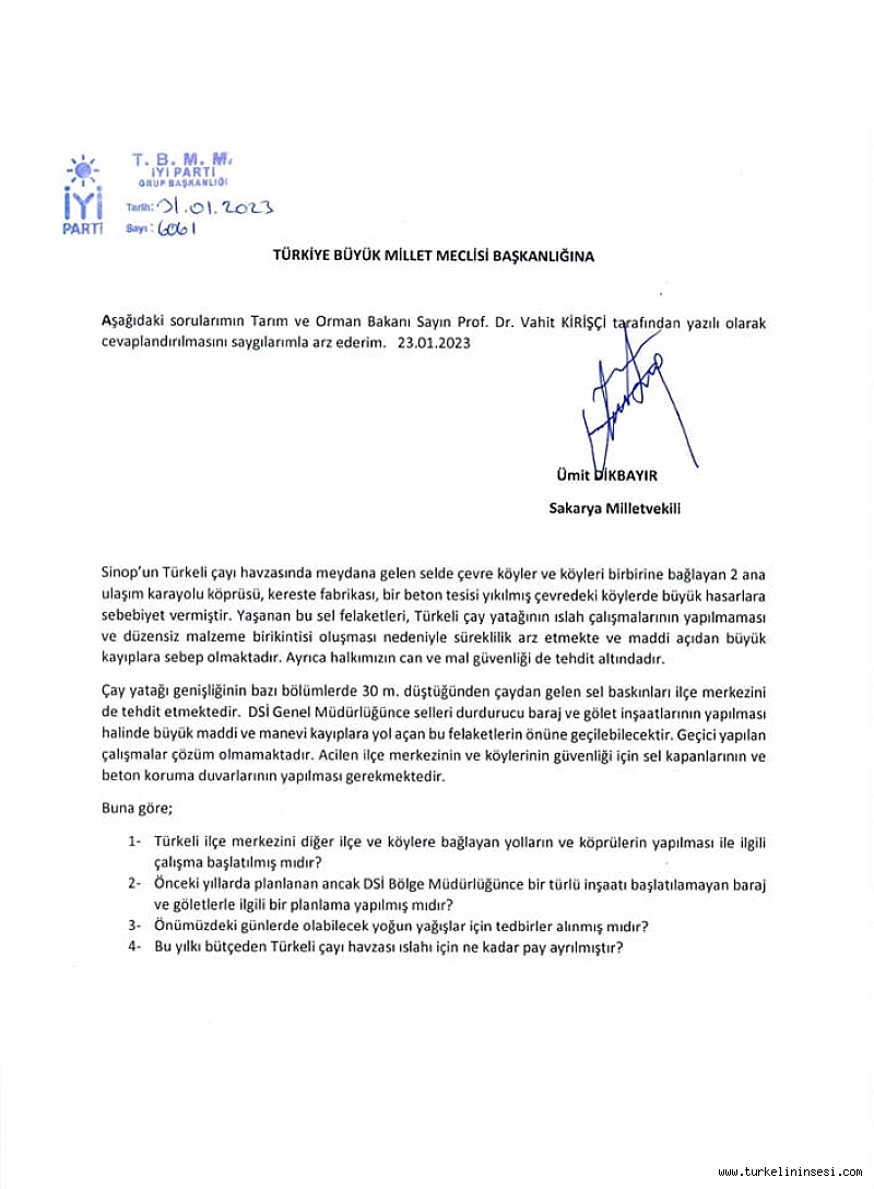 İYİ Parti Türkeli İlçe Başkanı Fikret Yılmaz, yaptığı açıklamada, “Türkeli ilçemizin tüm sorunlarını gündeme taşımaya, çözüm yolları aramaya, tüm gücümüz ile mücadele etmeye devam ediyoruz. Türkeli ilçemizdeki çözüm bekleyen kronik sorunlar ile ilgili Genel Başkan Yardımcımız ve Sakarya Milletvekilimiz sayın Ümit Dikbayır Bey'in aracılığı ile Türkiye Büyük Millet Meclisine verdirdiğimiz araştırma önergelerimizi hemşehrilerimiz ile paylaşıyoruz.” dedi.Dikbayır’ın Türkeli için TBMM’ye sunduğu soru önergesi:“Sinop'un Türkeli çayı havzasında meydana gelen selde, çevre köyler ve köyleri birbirine bağlayan 2 ana ulaşım karayolu köprüsü, kereste fabrikası, bir beton tesisi yıkılmış çevredeki köylerde büyük hasarlara sebebiyet vermiştir. Yaşanan bu sel felaketleri, Türkeli çay yatağının ıslah çalışmalarının yapılmaması ve düzensiz malzeme birikintisi oluşması nedeniyle süreklilik arz etmekte ve maddi açıdan büyük kayıplara sebep olmaktadır. Ayrıca halkımızın can ve mal güvenliği de tehdit altındadır.Çay yatağı genişliğinin bazı bölümlerde 30 metre düştüğünden çaydan gelen sel baskınları ilçe merkezini de tehdit etmektedir. DSİ Genel Müdürlüğünce selleri durdurucu baraj ve gölet inşaatlarının yapılması halinde büyük maddi ve manevi kayıplara yol açan bu felaketlerin önüne geçilebilecektir. Geçici yapılan çalışmalar çözüm olmamaktadır. Acilen ilçe merkezinin ve köylerinin güvenliği için sel kapanlarının ve beton koruma duvarlarının yapılması gerekmektedir.Buna göre;