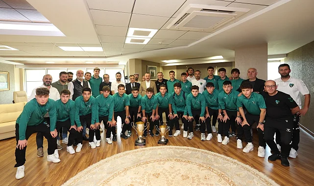 Kocaelispor'da ağabeylerinin izinden giderek Bölgesel Gelişim Ligi Türkiye Şampiyonu olan U19 Takımı, kupalarıyla birlikte Kocaeli Büyükşehir Belediye Başkanı Doç.Dr.Tahir Büyükakın'ı ziyaret etti.KOCAELİ (İGFA) - Trendyol 1.Lig'de şampiyon olarak Süper Lig hasretine son veren Kocaelispor'un gençleri de U19 Ligi'nde Türkiye Şampiyonu olarak ikinci bir sevinç yaşatmıştı.Çok güçlü rakipleri arasından sıyrılarak finale kadar yükselen gençler, son maçta Bursa temsilcisi 1923 Mustafa Kemalpaşaspor'u penaltı atışları sonunda 4-3 yenerek kupanın sahibi olmuştu.Şampiyon ekip bugün Kocaelispor Yönetim Kurulu Üyesi ve Alt Yapı Akademi Başkanı Rafet Kırgız, Kocaelispor Genel Koordinatörü Aydın Günaydın, Kocaelispor U17 takımı teknik sorumlusu Murat Tiryaki, yöneticiler Hamza Bostan, İsmail Solmaz, Burak Gülener, İsmail Taş ve futbolcularla Kocaeli Büyükşehir Belediye Başkanı Doç.Dr.Tahir Büyükakın'a geldi.Öte yandan altyapı başkanı Rafet Kırgız da, Büyükakın'a katkılarından dolayı teşekkür etti.Büyükakın'ın yalnızca A Takıma değil, altyapıya da büyük destekleri olduğunu, bu sayede başarıların geldiğini kaydetti, "Başkanımıza şükran borçluyuz, iyi ki varsınız" dedi. Başkan Büyükakın, bundan sonra da altyapıya desteklerinin süreceğini, gelecek sezonlarda da şampiyonluklar beklediklerini ama asıl önemli olanın A Takım'a altyapıdan daha çok oyuncunun yükselmesini önemsediklerini belirtti, ziyaretlerinden dolayı Yeşil-Siyahlı ekibe teşekkür etti.