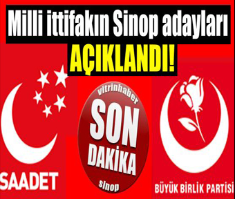 7 Haziran seçimlerine Saadet Partisi çatısı altında ittifak yaparak giren Saadet Partisi ile BBP’nin Sinop'ta ki aday listesi kesinleşti.'Milli İttifak'ın adayları 1. sırada iş adamı Mehmet Ali Özgür, 2. sırada ise genç iş adamı Hasan Üçüncüoğlu olarak belirlendi. Saadet Partisi İl Başkanı Cavit Üçüncüoğlu, Saadet Partisi BBP ittifakının 8 Haziran’da Türkiye’de daha güzel günlerin başlamasını sağlayacağını söyledi. Üçüncüoğlu, söz konusu işbirliğini “Milli İttifak” olarak nitelendirildiğini hatırlatarak, Sinop'taki aday listesini açıkladı. Üçüncüoğlu; "Bilindiği gibi 7 Haziran 2015 Genel Seçimlerine Saadet Partisi Genel Başkanı Sayın Mustafa Kamalak bey ile kardeş partimiz Büyük Birlik Partisi Genel Başkanı sayın Mustafa Destici bey birlikte girmeye karar vermişlerdir. Her iki partimizin kıymetli yöneticilerinin yapmış olduğu istişareler sonucunda Sinop milletvekili adaylık yarışında 1.sıra için Mehmet Ali Özgür, 2.sıra için ise Hasan Üçüncüoğlu uygun görülmüştür" dedi. Milli ittifakın ikinci sıra adayı Hasan Üçüncüoğlu'da yaptığı açıklamada; "Sinop Milletvekili Adaylığına layık gören ve şahsımı bizzat arayıp bilgilendiren Saadet Partisi Genel Başkan Yardımcısı Hasan Bitmez beye ve komisyon üyelerine sonsuz şükranlarımı sunarım. Ömrünü vatan, millet ve İslam davasına adamış, hiçbir şartta karanlık odaklarla ve menfaat çeteleriyle iş birliği içinde olmamış olan liderlerimiz merhum cennet mekan Prof. Dr. Necmettin Erbakan hocamız ve aynı zeminde siyaset yapan devlet büyüğümüz, şehidimiz Koca Reis Muhsin Yazıcıoğlu’nu ve tüm şehitlerimizi bir kez daha rahmetle, minnetle, şükranla yad ediyoruz. Onların onurlu duruşunu ve mücadelesini yüce milletimiz takdir etmektedir. Onların davasına sahip çıkan, ülküsünü benimsemiş ve bu yolda mücadele eden milyonlarca isimsiz kahramana şükranlarımızı sunuyoruz" diye konuştu. Mehmet Ali Özgür1972 Sinop boyabat Boğumlu, 1989 yılından beri İstanbul Pendik te ikamet etmektedir. 1999 yılında Gerçek Haber postası ismiyle bölgesel gazete çıkardı, 2000 - 2005 yılları arasında (iki dönem) pendik SİYAD'ın(sinop ili ve ilçeleri kültür ve yardımlaşma derneği) başkanlığı yaptı, 1999 ve 2009 yılları arasında Fazilet Partisi ve Saadet partisinde yönetim ve icra kurulu üyeliği yaptı, 1999 - 2004 Mahalli seçimlerinde Pendik Belediye Meclis üyesi adayı 2007 Genel seçimlerinde İstanbul 1.Bölge Millet Vekili adayı Gösterildi. Halen Saadet Partisi İstanbul İl Başkan Yardımcılığı görevinde bulunmaktadır. Mobilya, Beyaz eşya, Gıda, Tekstil sektörlerinde Ticaretle uğraştı ve iki Adet Şirket kurdu. Şuanda İnşaat Müteahhitliği yapmaktadır. Evli ve 2 Çocuk Babasıdır.Hasan Üçüncüoğlu1983 Sinop, Merkez doğumlu. Sinop İstiklal İlköğretim Okulu ve 2000 yılında Sinop İmam Hatip Lisesi’nden mezun oldu. 1996 yılında Refah Partisi’yle başladığı siyasi hayata Fazilet Partisi ve Saadet Partisi’nde devam etti ve uzun yıllar çeşitli görevlerde bulundu. Son olarak da Sinop Gençlik Kolları İl Başkanlığı yaptı.2001 yılında ticari hayata Sinop’ta bulunan Üçüncüoğlu ROT-BALANS’ta başladı. 2011 yılından itibaren birçok popüler markanın lastik satış/servis hizmetini de bünyesine katarak sektördeki faaliyet alanını büyüttü ve halen aynı sektörde ticari faaliyetlerine devam etmektedir. Şubat 2008 yılında vatani görevini tamamladıktan sonra 2009 ve 2014 yerel seçimlerinde Sinop İl Genel Meclis Üyesi Adayı gösterildi. Üçüncüoğlu 2011-2014 yılları arasında yerel bir gazetede gazetecilik de yaptı. Halen çeşitli sivil toplum örgütlerinde (SİMDER, KIZILAY, AGD) aktif faaliyetlerde bulunmakta olan Hasan ÜÇÜNCÜOĞLU, evli ve bir çocuk babasıdır.