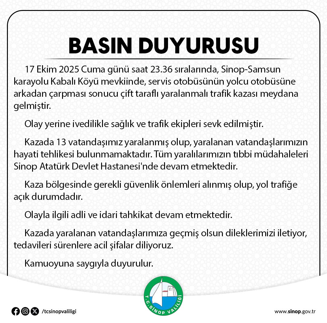 Kaza saat 23.30 sıralarında Sinop merkeze bağlı Kabalı köyü yol ayrımında meydana geldi. Edinilen bilgiye göre,, seyir halindeki bir tekstil firmasına ait işçi servisi, aynı istikamette ilerleyen yolcu otobüsüne arkadan çarptı. Çarpmanın etkisiyle her iki araçta da büyük hasar meydana gelirken, çok sayıda kişi yaralandı.İhbar üzerine olay yerine ambulans, jandarma ve itfaiye ekibi sevk edildi. Yaralılar, sağlık ekiplerinin ilk müdahalesinin ardından Sinop Atatürk Devlet Hastanesi'ne kaldırıldı.Valilikten konu ile ilgili açıklama geldi. Açıklamada kazada yaralanan kişi sayısının 13 olduğunu açıkladı.Açıklamada şöyle denildi: