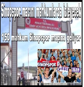 Sinopspor 2 Eylül 2015 Çarşamba günü bugün saat 16:00’da Dokuzoğlu Şehir Stadyumunda Çankırı Belediye Gençlikspor ile Ziraat Türkiye Kupası Ön Eleme Maçı yapacak.Maçı Sinop Açık Ceza İnfaz Kurumu’nda bulunan yaklaşık 150 mahkumun izleyeceği öğrenildi. Sinop Cumhuriyet Başsavcılığı'nın onayıyla, mahkumların iyileştirilmesi, sosyalleştirilmesi ve toplumla bütünleşmesini sağlamak amacıyla Açık Ceza İnfaz Kurumunda bulunan 150 mahkumun maça getirileceği söylendi.Haber: A. Fatih YILMAZ - Bizim Karadeniz