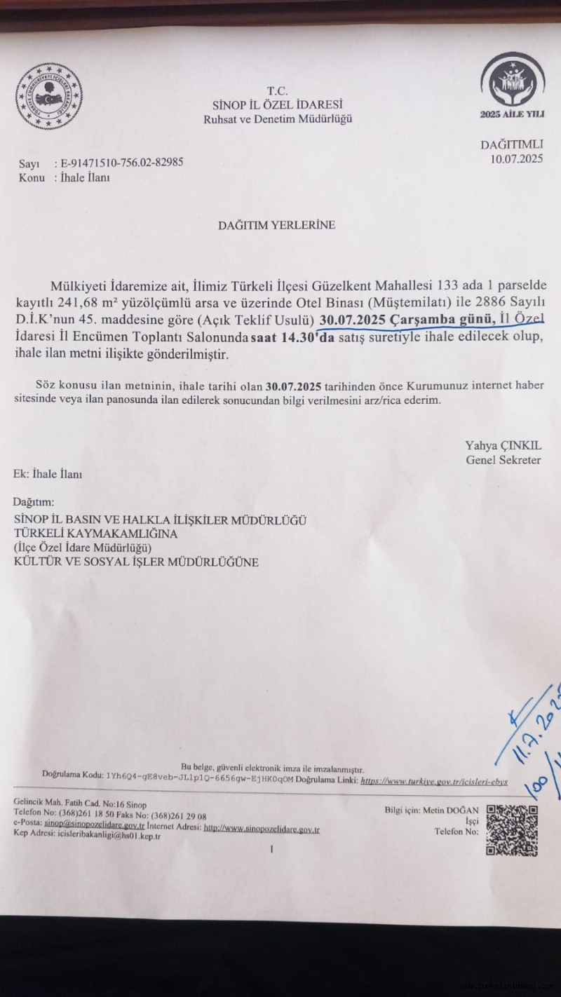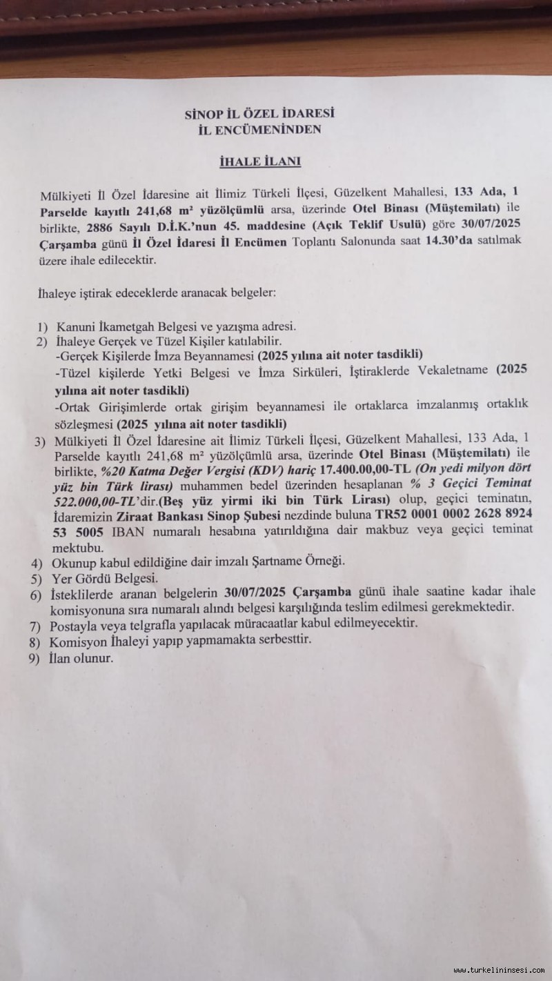 Sinop’un Türkeli ilçesine bağlı Güzelkent Mahallesi’nde, Sinop İl Özel İdaresi mülkiyetinde bulunan otel ve arsası satışa sunuluyor.Denize sıfır konumda yer alan ve turizm potansiyeli yüksek olan taşınmaz, 30 Temmuz 2025 Çarşamba günü saat 14:30’da, Sinop İl Özel İdaresi Binası’nda gerçekleştirilecek açık ihale usulü ile satışa çıkarılacak.241 metrekare yüzölçümüne sahip arsa üzerinde yer alan ve toplam 829 metrekare kapalı alana sahip otel, zemin, birinci ve ikinci kattan oluşuyor. Otel içerisinde 15 oda ve 40 yatak kapasitesi bulunurken, zemin katında restoran bölümü yer alıyor.Restoran bölümü, Çevre, Şehircilik ve İklim Değişikliği Bakanlığı standartlarına uygun şekilde inşa edilmiş olup, canlı müzik yapılmasına olanak tanıyan özel ses yalıtım sistemine sahip.Tesisin en dikkat çeken bölümlerinden biri ise zemin katın üstünde yer alan geniş terası. Muhteşem bir deniz manzarasına sahip olan bu alan, konuklara keyifli anlar sunabilecek nitelikte.Hem yatırımcılar hem de turizm işletmecileri için önemli bir fırsat sunan bu satışla ilgili detaylı bilgilere Sinop İl Özel İdaresi’nin resmi kanalları üzerinden ulaşılabileceği belirtildi.
