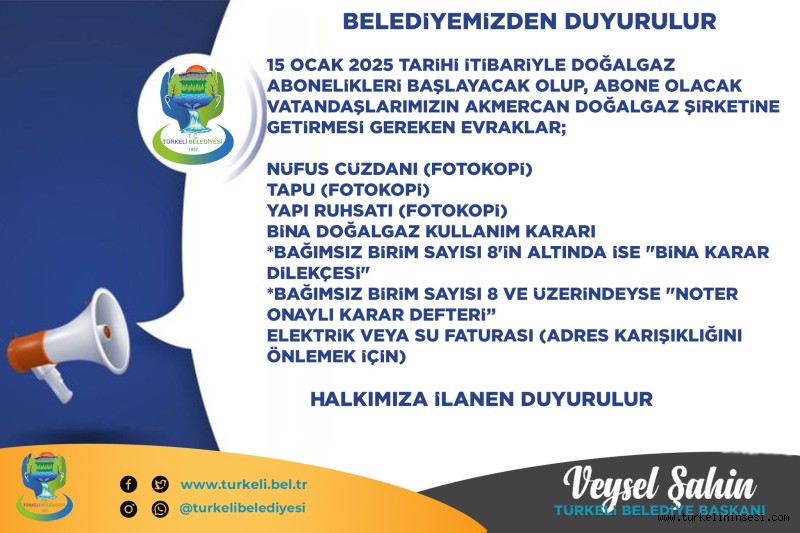 Elektrik veya su faturası (adres karışıklığını önlemek amacıyla)Vatandaşların başvurularını Akmercan Doğalgaz Abonelik Merkezine iletmesi gerektiği vurgulandı.Belediye yetkilileri, doğalgaz aboneliği işlemlerinin 15 Ocak 2025 tarihi itibarıyla başlayacağını ve bu süreçte vatandaşların gerekli evrakları eksiksiz bir şekilde teslim etmeleri gerektiğini hatırlatarak, sürecin sorunsuz bir şekilde ilerlemesini beklediklerini ifade etti.