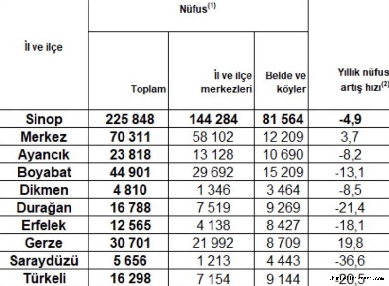 TÜİK verilerine göre Türkeli ilçe merkezinin nüfusu geçen yıla göre 44 kişi artarak 7 bin 154’e yükseldi. İlçe merkezinde artış yaşanırken, köylerin büyük bölümünde ise nüfus düşüşü devam etti.Köylerdeki düşüş nedeniyle Türkeli’nin kırsal nüfusu geçen yıla göre 444 kişi azaldı. Buna göre köylerle birlikte Türkeli’nin toplam nüfusu 16 bin 308 olarak kayıtlara geçti.2025 verilerine göre Türkeli’nin en kalabalık köyü Güzelkent (946 kişi) olurken, onu Kayabaşı (500) ve Direkli (517) köyleri izledi.En düşük nüfusa sahip köyler ise Çatakgeriş (97), Sazkışla (148) ve Gündoğdu (144) olarak kayıtlara geçti.Merkez nüfusunda artış sürerken, özellikle göç ve yaşlanan nüfus nedeniyle birçok köyde düşüş yaşanması dikkat çekti.Türkeli 2024 – 2025 Köy Nüfus Karşılaştırması