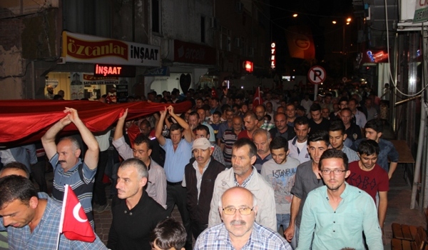 İlçemizde "Şehitlere Saygı, Teröre Lanet" yürüyüşüne yaklaşık 2 bin kişi katıldı.Türkeli Ülkü Ocakları tarafından düzenlenen "Şehitlere Saygı, Teröre Lanet" yürüyüşüne, Türkeli Belediye Başkanı Halil Dilek Özcan, MHP Türkeli İlçe Başkanı Murat Yıldırım, CHP Türkeli İlçe Başkanı Tugay Dincel ve çok sayıda vatandaş katıldı.Belediye Meydanı'nda toplanan halk, terörü lanetleyerek İlçe Jandarma Komutanlığı önüne yürüdü. 8 Eylül'de Mardin'de saldırıda yaralanan Türkelili hemşehrimiz polis memuru Levent Özdemir'in de unutulmadığı yürüyüşte, "Şehitler Ölmez, Vatan Bölünmez", "Vatan Sana Canım Feda" sloganları atıldı.Türkeli Ülkü Ocakları Başkanı Ayhan Yılmaz, İlçe Jandarma Komutanlığı önünde basın açıklamasında bulundu. Yılmaz açıklamasında, "PKK tarafından gerçekleştirilen kahpe saldırılarda şehit edilen askerlerimiz, milletimizi çok büyük bir üzüntüye sevk etmiş, ciğerlerimizi sızlatmıştır.Bölücüler, Türkiye tarihinde hiçbir zaman görülmediği ölçüde etkinlik kazanmıştır. Bu rezil politikalar 'çözüm' adı altında uygulanmış ve ne yazık ki bugünkü sonuçları doğurmuştur. Bunca acının yaşandığı bir ortamda utanmadan, arlanmadan Türk milletinin aklıyla alay edilmektedir. Mehmetçiklerimizin canı üzerinden siyasi hesap yapmak, insani ve vicdani hiçbir ilkeyle açıklanamaz. İnsan olan böylesi bir zilletin içinde olamaz.Terörü palazlandıran, meşrulaştırmaya çalışan ve teröre sessiz kalanlar da en az teröristler kadar suçludur ve aşağılıktır. Türk Milleti, terörün yayılmasına fırsat veren siyasetçileri, terörü meşrulaştırmaya çalışan yazarları, teröre yardım ve yataklık eden yerli ve yabancı bütün unsurları hafızasında tutacak ve hesapların görüleceği günü sabırsızlıkla bekleyecektir. Milli birlik ve bütünlüğümüze kast eden herkes, bu ihanetin bedelini de ödeyecektir. Türk milletinin sabrını sınayanlar, gücünü test edenler mukadder yenilgileriyle muhakkak yüzleşecektir. Şehitlerimize Yüce Allah'tan rahmet, kederli ailelerine sabırlar niyaz ediyoruz. Canımız tende olduğu müddetçe, hatırlarını yaşatacağımıza ve intikamlarını muhakkak alacağımıza dair söz veriyoruz. Büyük Türk Milleti'nin başı sağ olsun." dedi.Konuşmanın ardından emekli İmam Hatibi Fikret Yılmaz tarafından dua yapıldı. Akabinde vatandaşlar, ellerinde Türk bayraklarıyla Cumhuriyet Caddesi, Erdembey Caddesi ve Mustafa Bozkurt Caddesi'nde yürüyüş yaparak sloganlar attı. Türkeli Belediye İtfaiyesi'nde ise yürüyüşteki Türk bayrağı itfaiye aracı merdiveni ile havaya kaldırılarak dalgalandırıldı. Bu sırada vatandaşlar bayrağın dalgalanmasını alkışlarla izledi. Yeniden Belediye Meydanı'na gelen vatandaşlar burada da sloganlar atmasıyla yürüyüş son buldu.