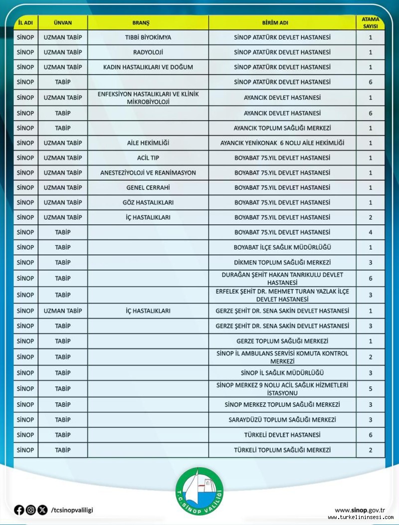 Sağlık Bakanlığı tarafından gerçekleştirilen 2025 Yılı 124. Dönem Devlet Hizmeti Yükümlülüğü Kurası kapsamında Türkeli’ye 8 doktor atandı.Kura sonucuna göre, Sinop genelinde 12 uzman hekim ve 58 tabip olmak üzere toplam 70 sağlık personeli görevlendirildi. Türkeli’de ise Devlet Hastanesi’ne 6, Toplum Sağlığı Merkezi’ne 2 olmak üzere 8 doktorun ataması yapıldı.Atamaların ardından ilçedeki sağlık hizmetlerinin daha da güçlenmesi bekleniyor.