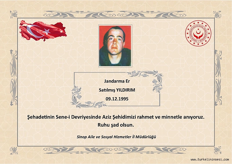 İstanbul’da, bölücü terör örgütünün 9 Aralık 1995 tarihinde düzenlediği silahlı saldırı sonucu şehit olan Türkeli’nin Kayabaşı köyü nüfusuna kayıtlı şehit Jandarma Er Satılmış Yıldırım’ı şehadetinin 28. sene-i devriyesinde rahmet ve minnetle anıyoruz.