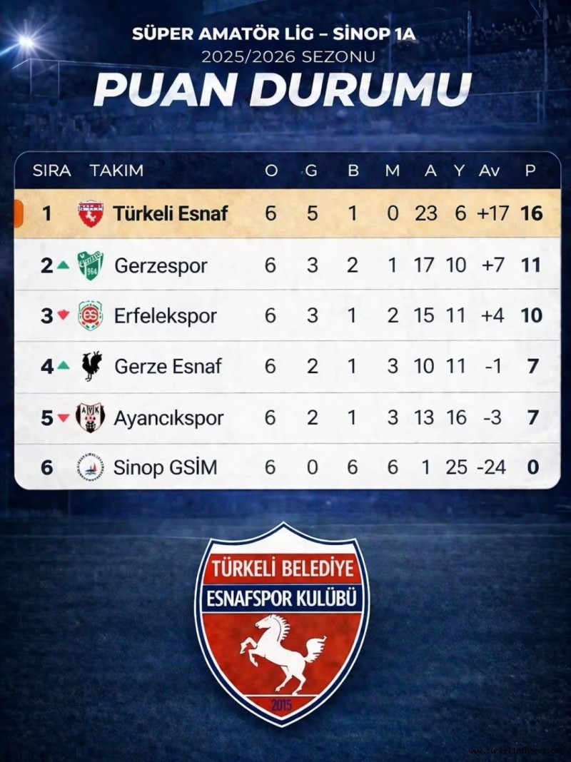 5 Nisan 2026 Pazar günü saat 15.00’te oynanan mücadelede temsilcimiz, karşılaşmanın 35. dakikasında Ahmet Ürer’in kaydettiği golle 1-0 öne geçti. İlk yarıda başka gol sesi çıkmayınca Türkeli ekibi soyunma odasına avantajlı girdi.İkinci yarıda baskısını artıran ev sahibi Erfelekspor, 78. dakikada İkram Yılmaz’ın golüyle skora denge getirdi. Ancak bu gole yanıt gecikmedi. Beraberlikten sadece iki dakika sonra yeniden sahneye çıkan Ahmet Ürer, attığı golle takımını 2-1 öne taşıdı.Kalan dakikalarda üstünlüğünü koruyan Türkeli Belediye Esnafspor, zorlu deplasmandan galibiyetle ayrılarak liderliğini sürdürdü. Bu sonuçla puanını artıran temsilcimiz, en yakın rakipleriyle arasındaki farkı 5’e çıkararak zirve yarışında önemli bir avantaj elde etti.